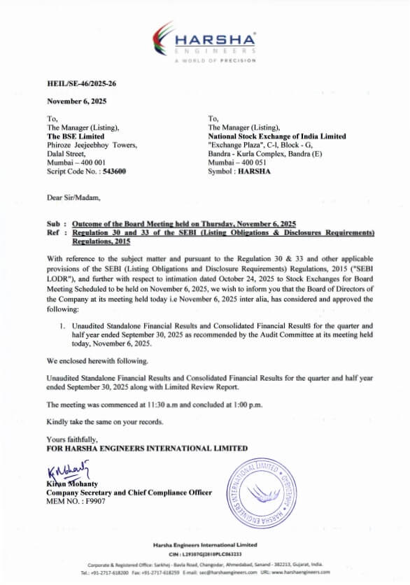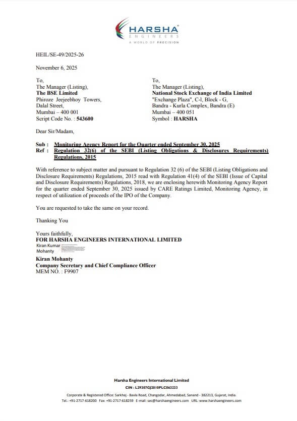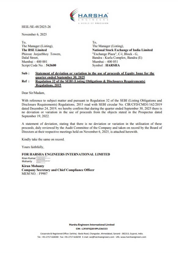 Details of Key Managerial Personnel under Regulation 30 (5) of SEBI (Listing Obligations and Disclosure Requirements) Regulations, 2015 of Harsha Engineers International Limited (Formerly Known as Harsha Engineers International Private Limited and Harsha Abakus Solar Private Limited)